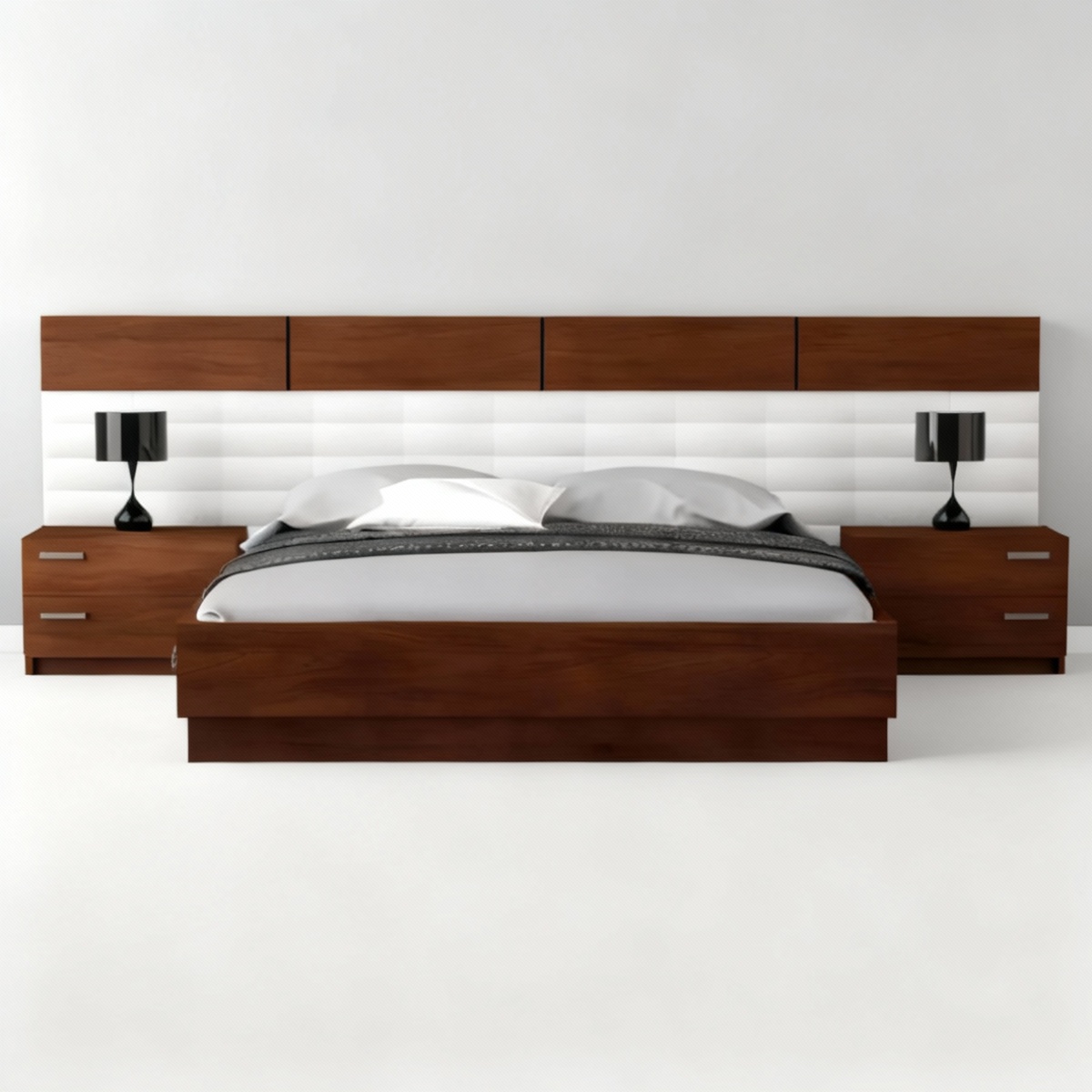 El conjunto Fougeres aporta un toque de distinción al dormitorio mediante un respaldo de cama tapizado, decorado con un patrón de paneles rectangulares que añaden textura y sofisticación. A cada lado, dos mesas de luz ofrecen almacenamiento práctico a través de dos amplios cajones, combinando limpieza visual con utilidad. Fabricado en melamina de alta calidad y tapizado en Talampaya (color blanco), el modelo Fougeres no solo actúa como un marco elegante para la cama, sino que también resguarda la pared de manchas y golpes, aportando confort, organización y estilo contemporáneo.