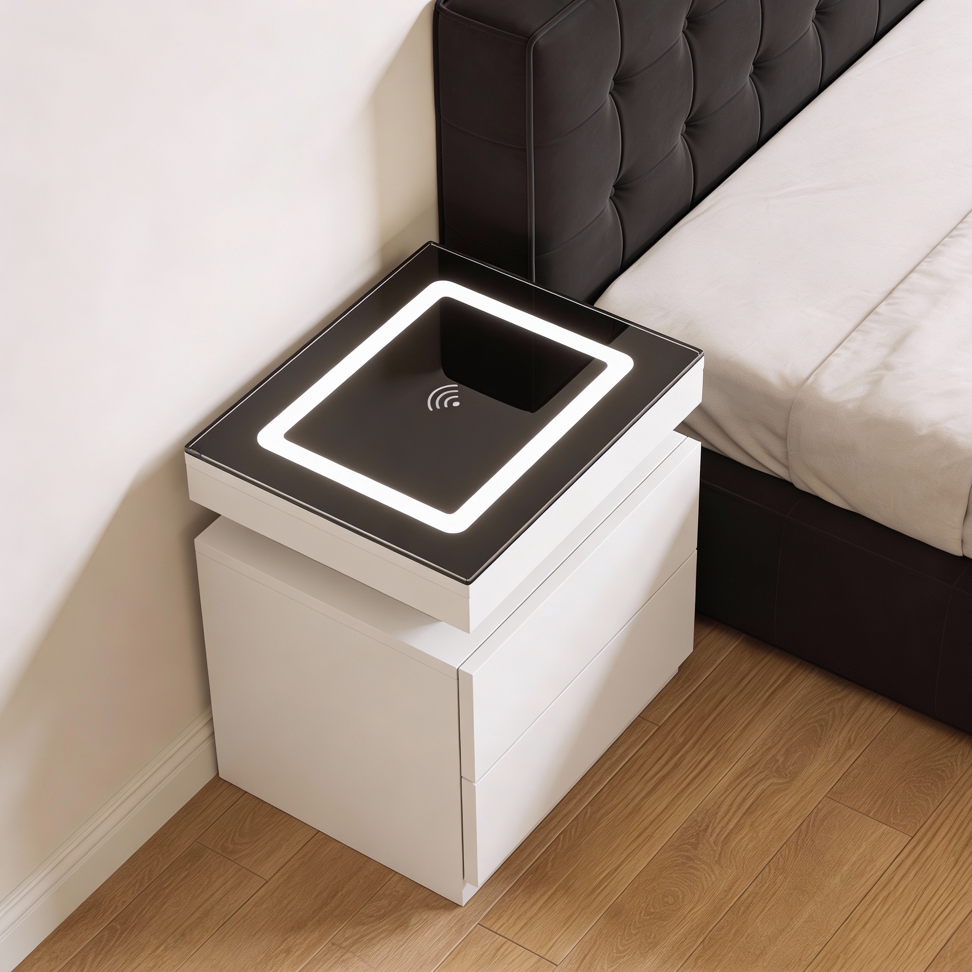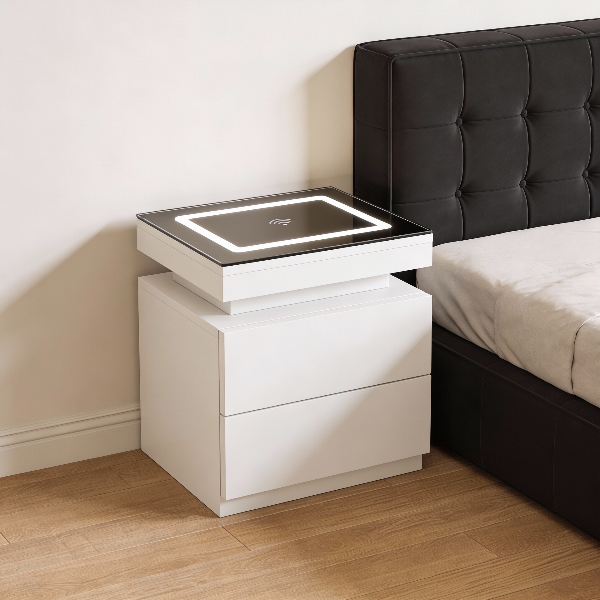 La mesa de luz ACHERY con Cargador Inalámbrico fusiona funcionalidad y estética moderna. Compacto pero práctico, ofrece almacenamiento justo al lado de la cama sin perder estilo.