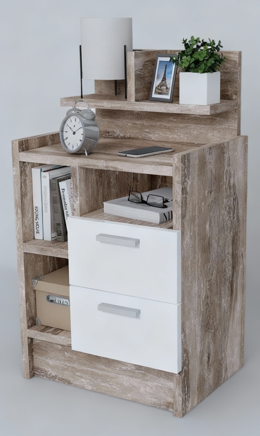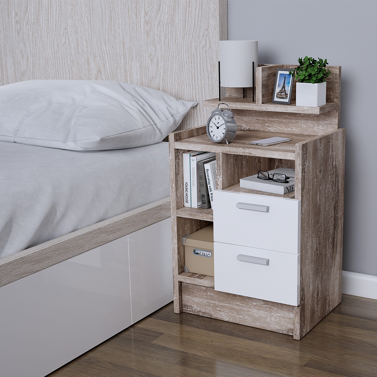 • Diseño realista y atractivo: Dos prácticos cajones con correderas metálicas que combinan estética y funcionalidad, ideales para mantener todo ordenado al lado de tu cama.